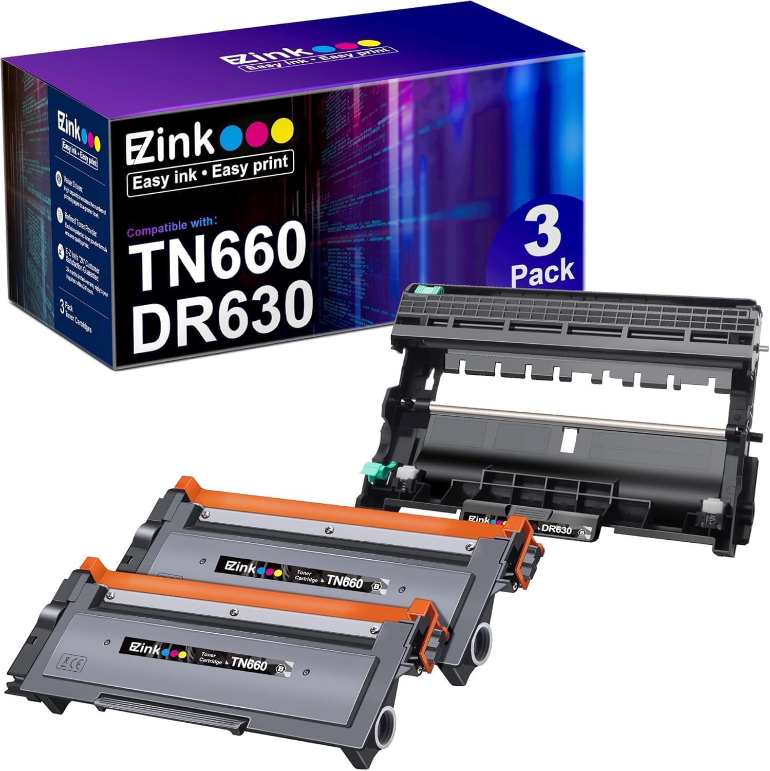 E-Z Ink Compatible Toner Cartridge & Drum Unit Replacement for Brother TN660 TN630 DR630 High Yield to use with HL-L2380DW HL-L2300D HL-L2340DW MFC-L2680W MFC-L2740DW Printer (Black, 3 Pack)